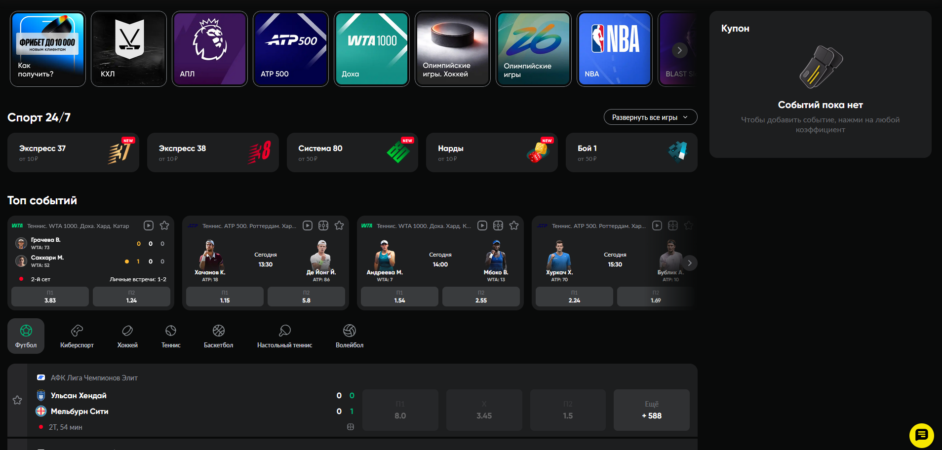 Головна структура БК контори розташує меню по спортам у лівій панелі: Футбол, Баскетбол, Теніс, Хокей, Кіберспорт. Обране матчі з'являються у центральній зоні з коефіцієнтами. Кнопка "Додати в купон" переміщує ставку на праву панель. На платформі Бет Бум встановлено швидкий доступ до вхід профілю, історії ставок і лічильника вейджеру в верхньому куті екрана.